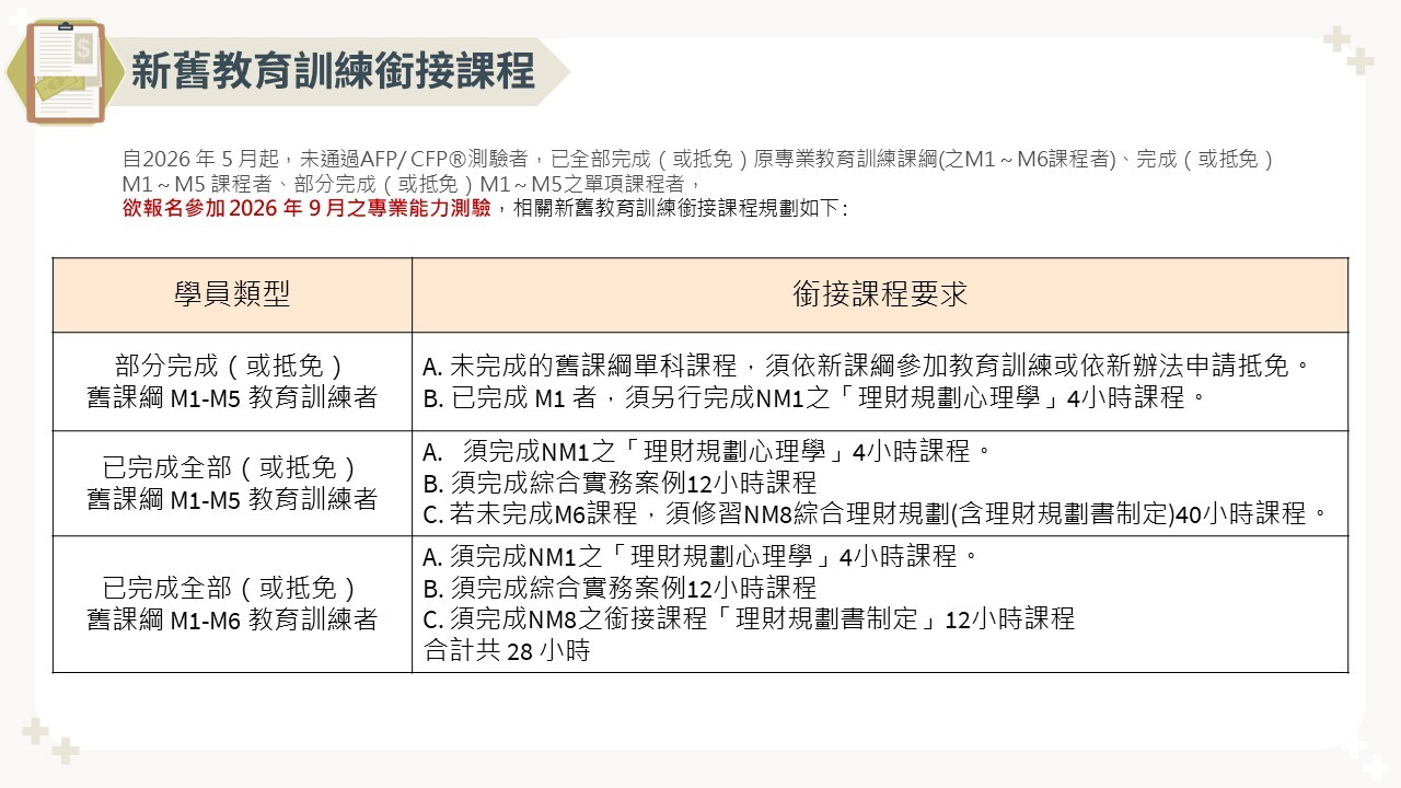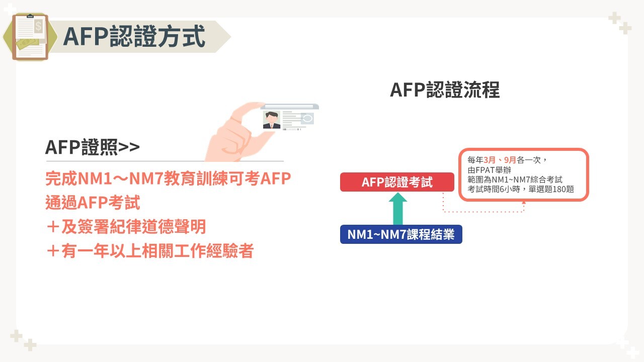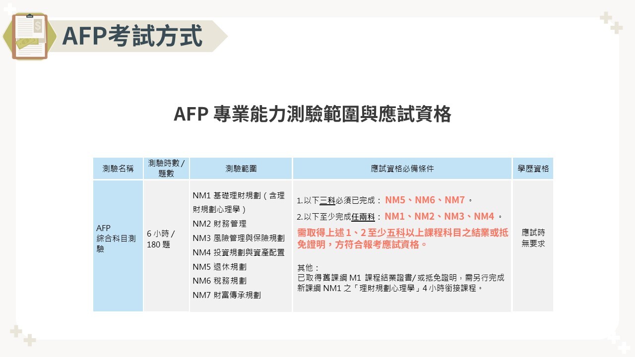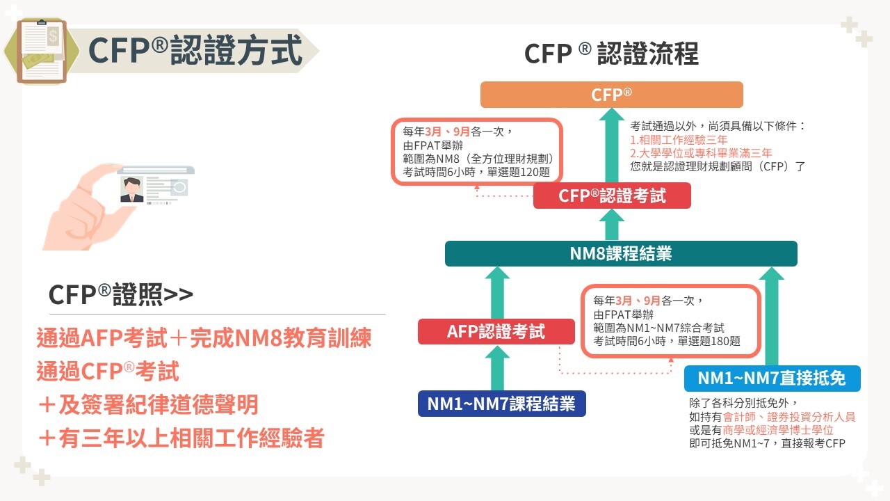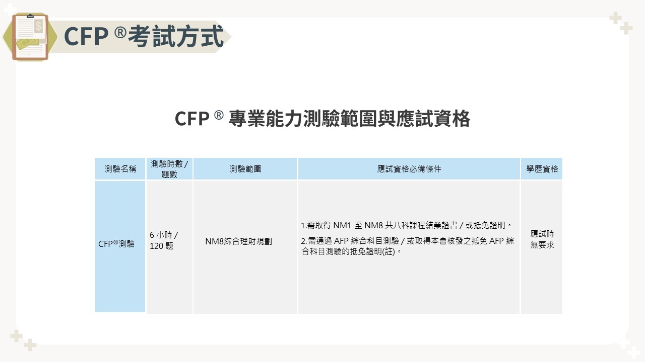 具有中華民國身分證、臺灣地區居留證、外僑永久居留證或大陸地區配偶領有長期居留證、港澳居留證且註明不需申請工作證者,對從事理財規劃顧問行業有興趣,願意協助客戶達成其理財規畫目標,且於測驗報名前具備該測驗所規範(結業或抵免通過)應試資格方可參加測驗。分別於每年3月及9月各舉行一次CFP®/AFP專業能力測驗。