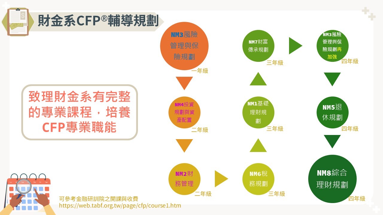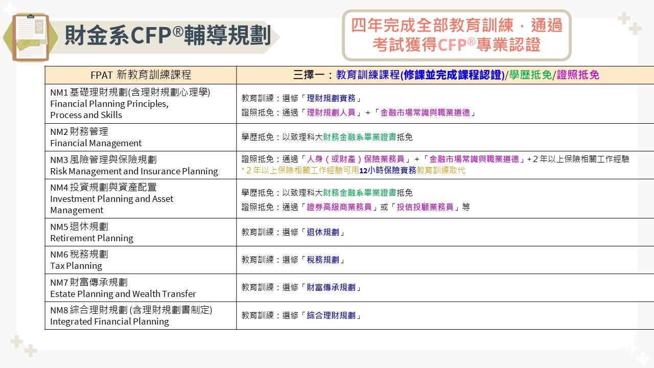 致理科技大學財務金融系自105年起成為FPAT授權之CFP®教育訓練機構,具有完善的課程規劃輔導建立全方位的理財規劃專業能力。