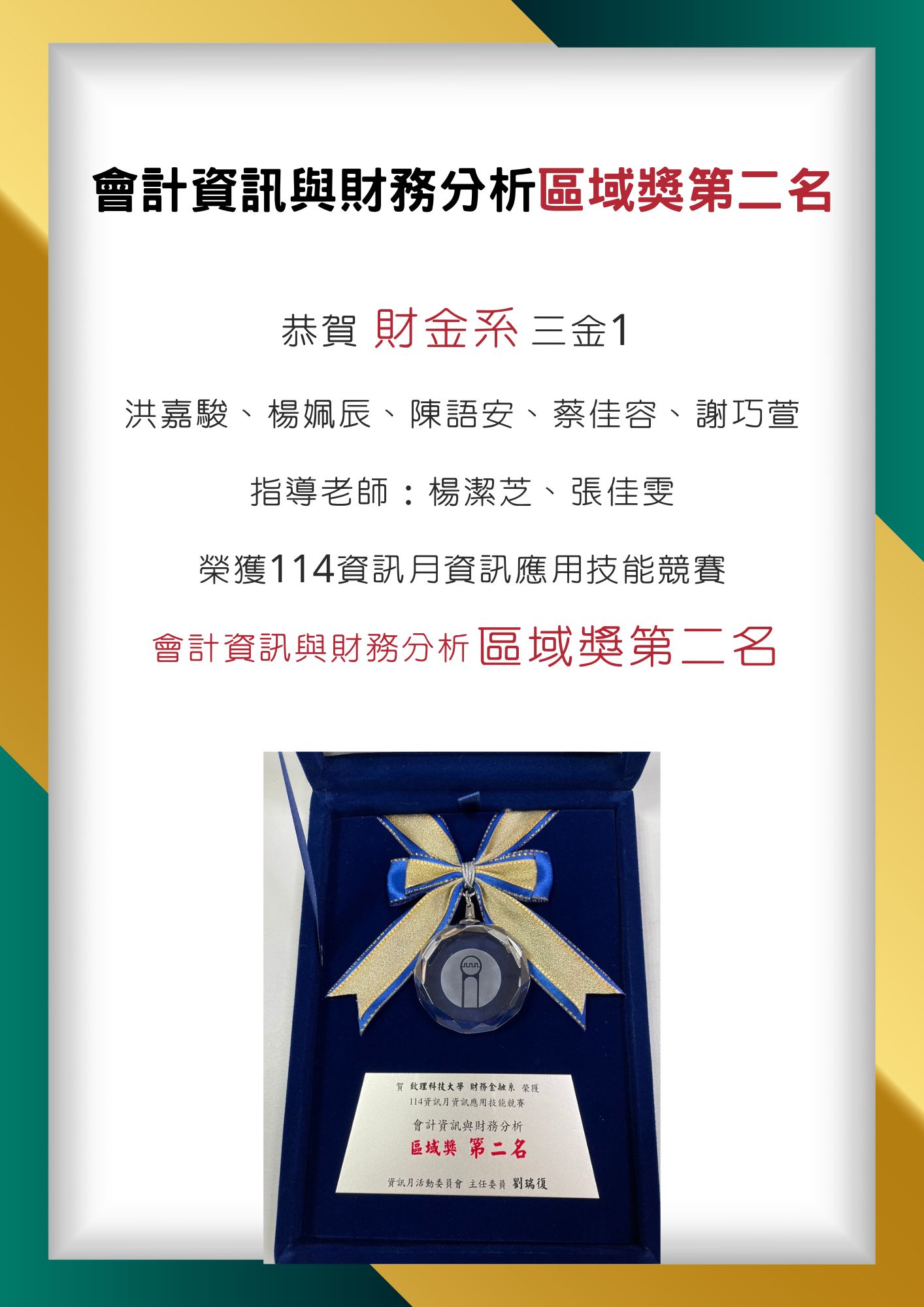 【財務金融系】賀!本系同學參加114年資訊應用技能競賽榮獲會計資訊與財務分析北區第二名