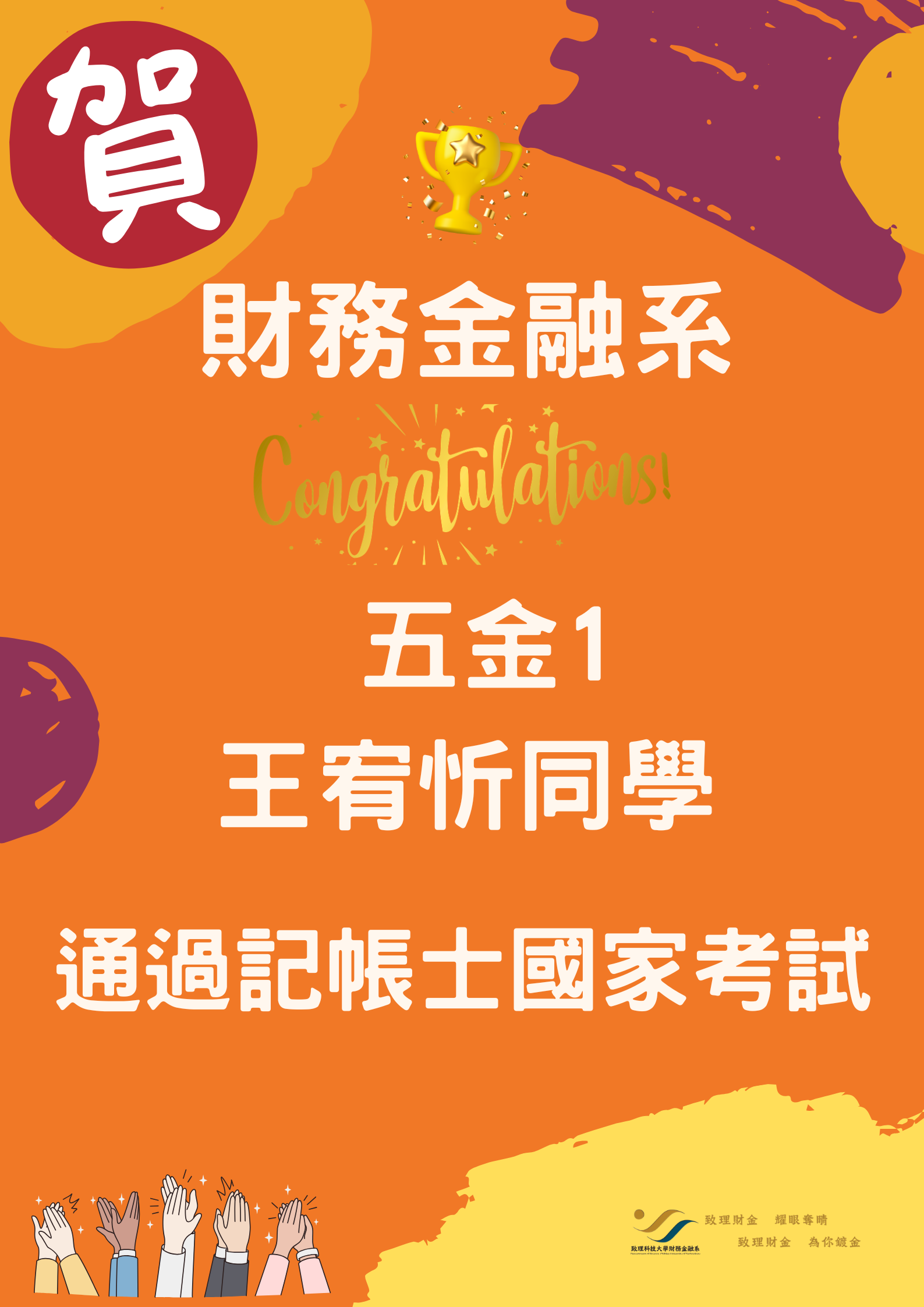 【財務金融系】賀!本系五金1王宥忻同學通過「記帳士」考試