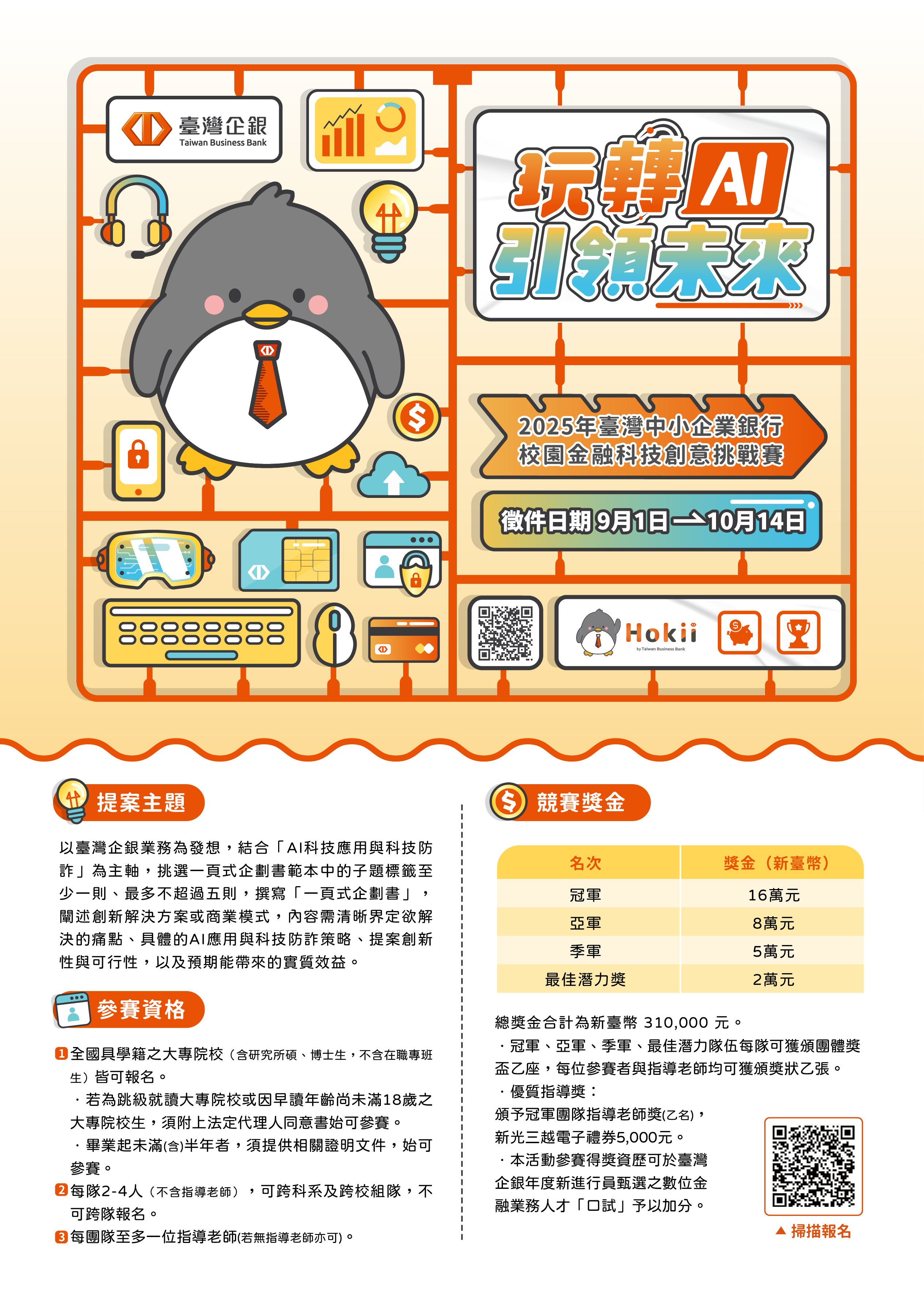 【活動公告】財團法人台灣金融研訓院與臺灣中小企業銀行校共同規劃辦理「2025年臺灣中小企業銀行校園金融科技創意挑戰賽」,歡迎師生踴躍組隊報名參加。