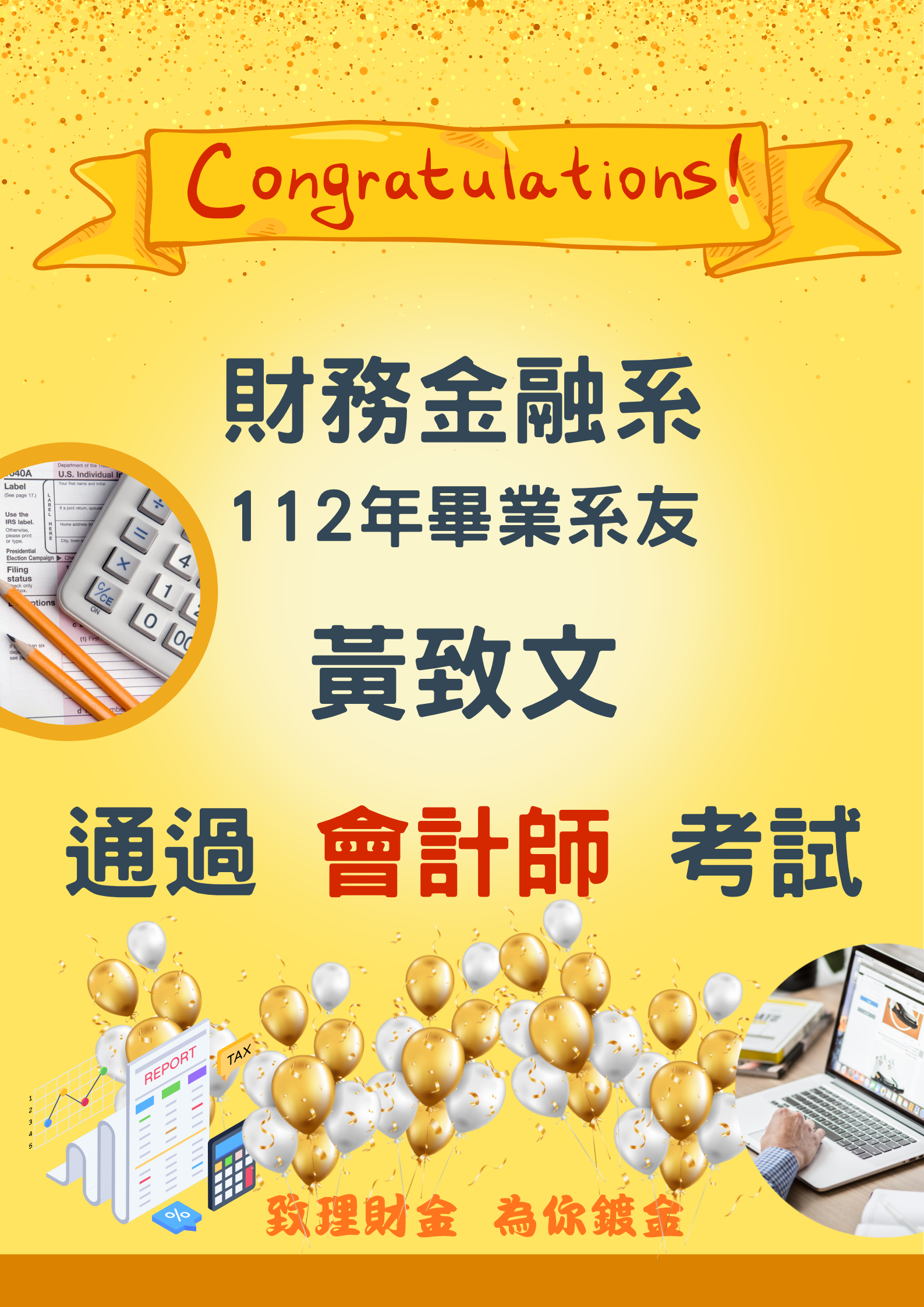 【財務金融系】賀!本系112年畢業系友 黃致文同學 通過114年度會計師高等考試!