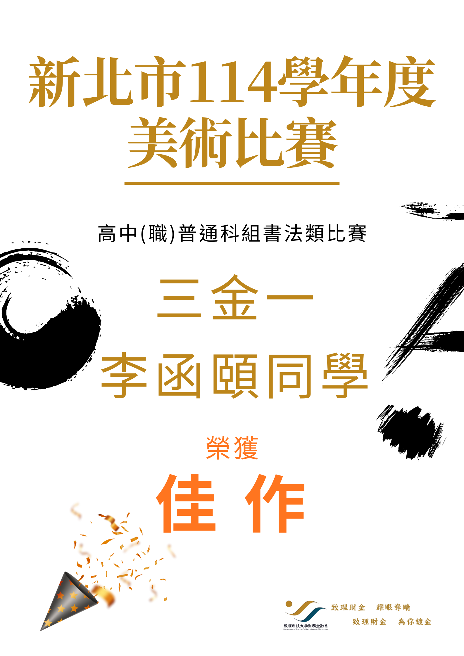 【財務金融系】賀!本系三金一李函頤同學參加新北市114學年度美術比賽高中(職)普通科組書法類比賽,榮獲佳作。