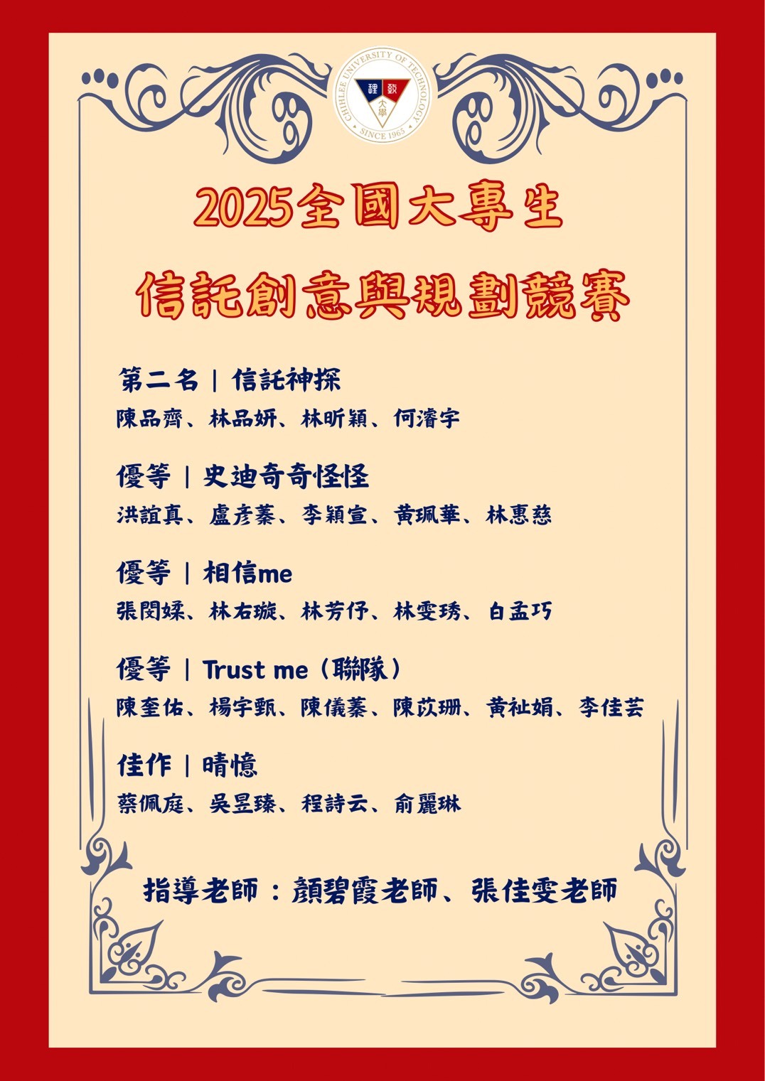 【財務金融系】賀!財金系師生參加2025全國大專生信託創意與規劃競賽獲獎無數