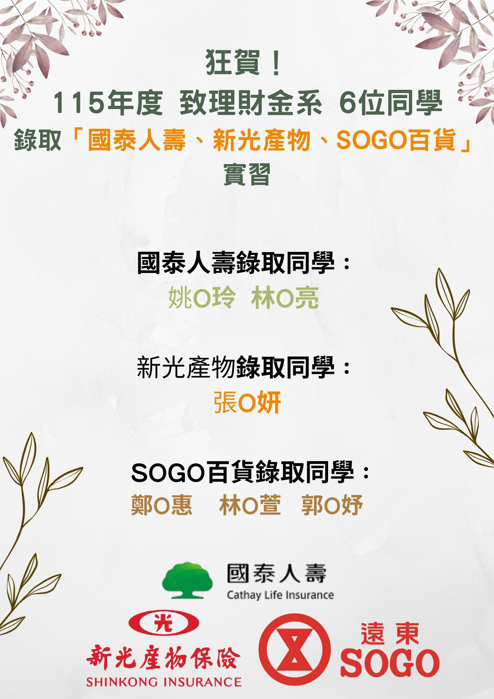 【財務金融系】賀!本系115年6位學生錄取「國泰人壽、新光產物、SOGO百貨」實習