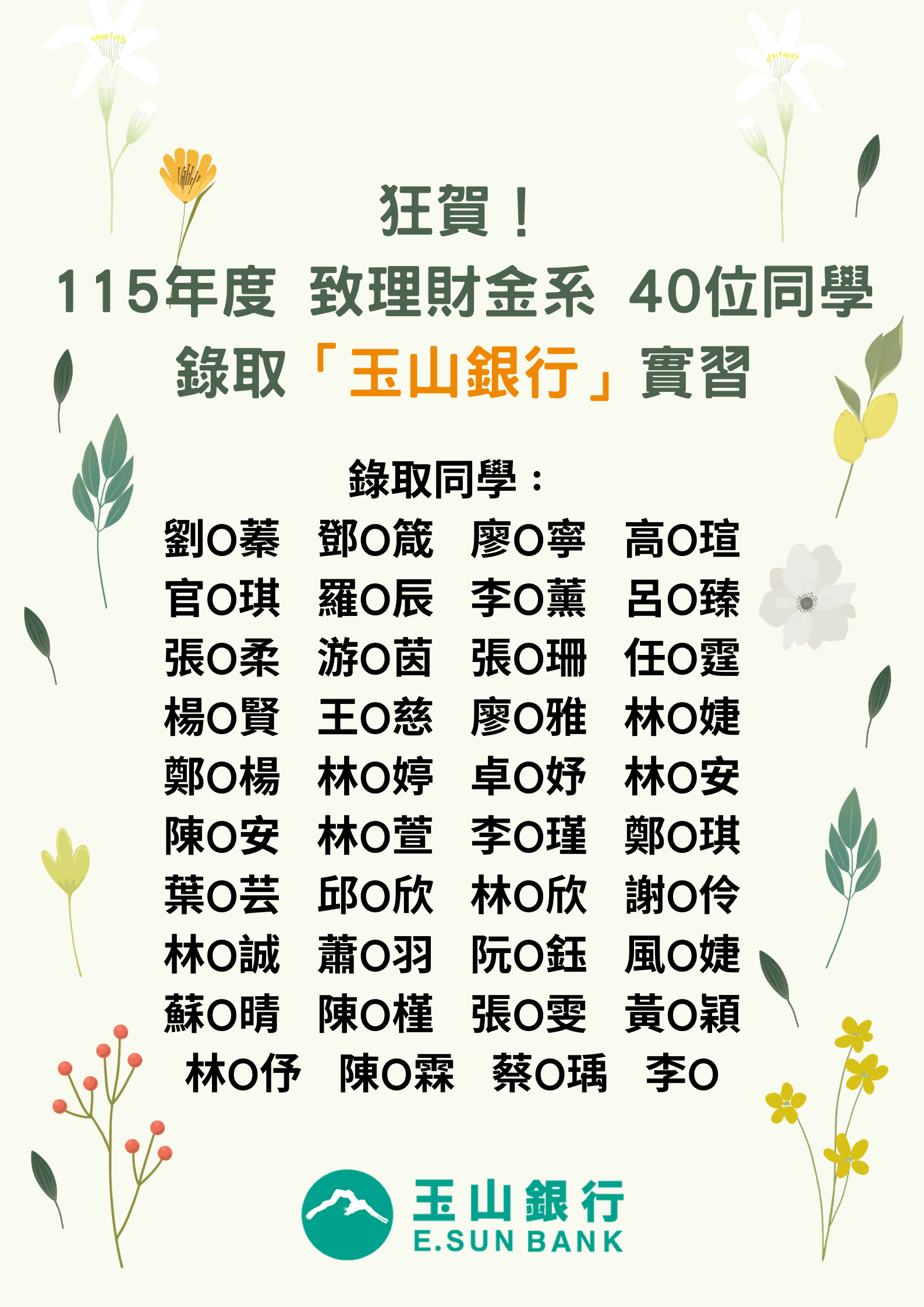 【財務金融系】賀!本系114年40位學生錄取「玉山銀行」實習