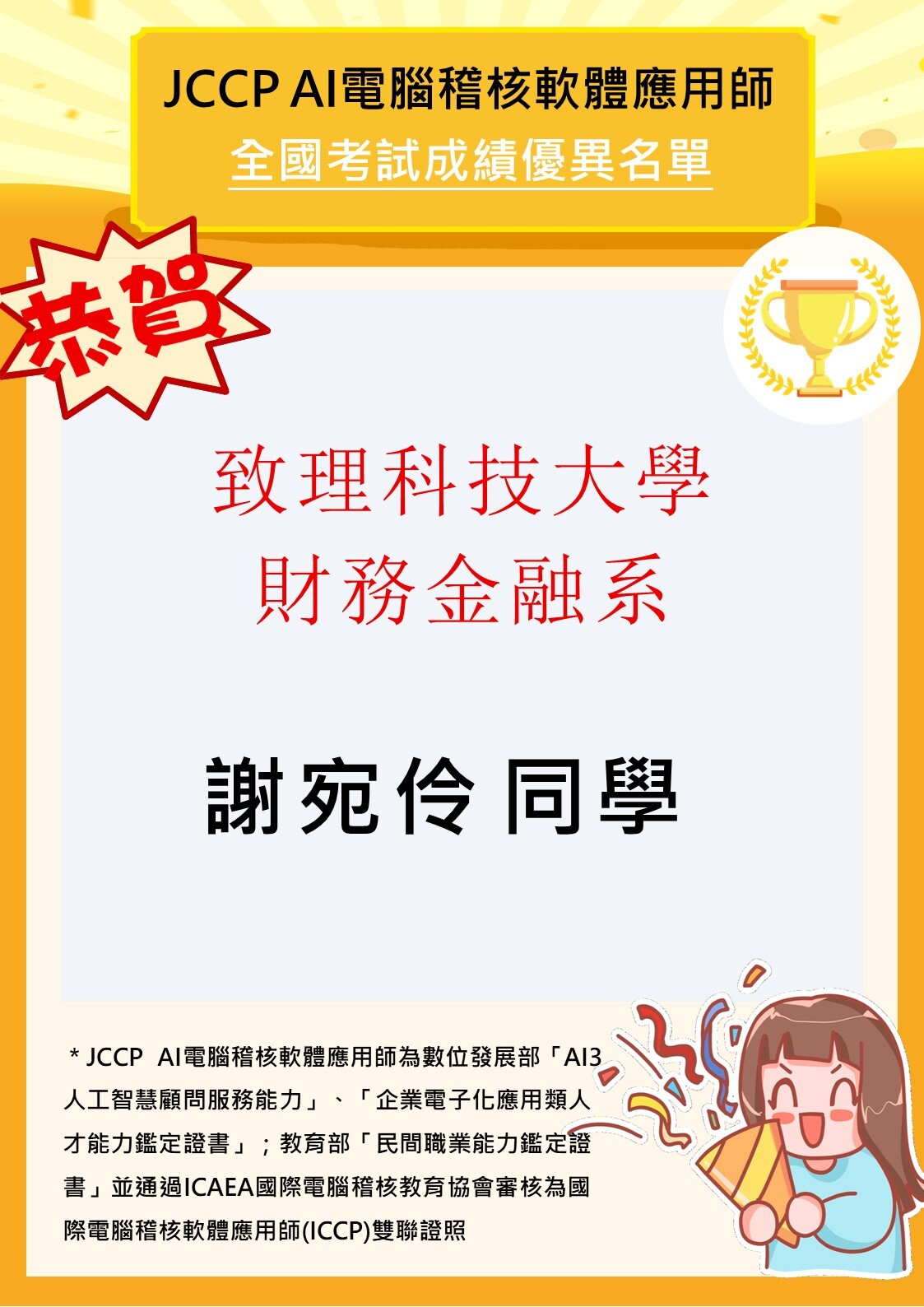 【財務金融系】賀!本系謝宛伶同學參加 JCCP AI電腦稽核軟體應用師認證考試名列全國前 3%