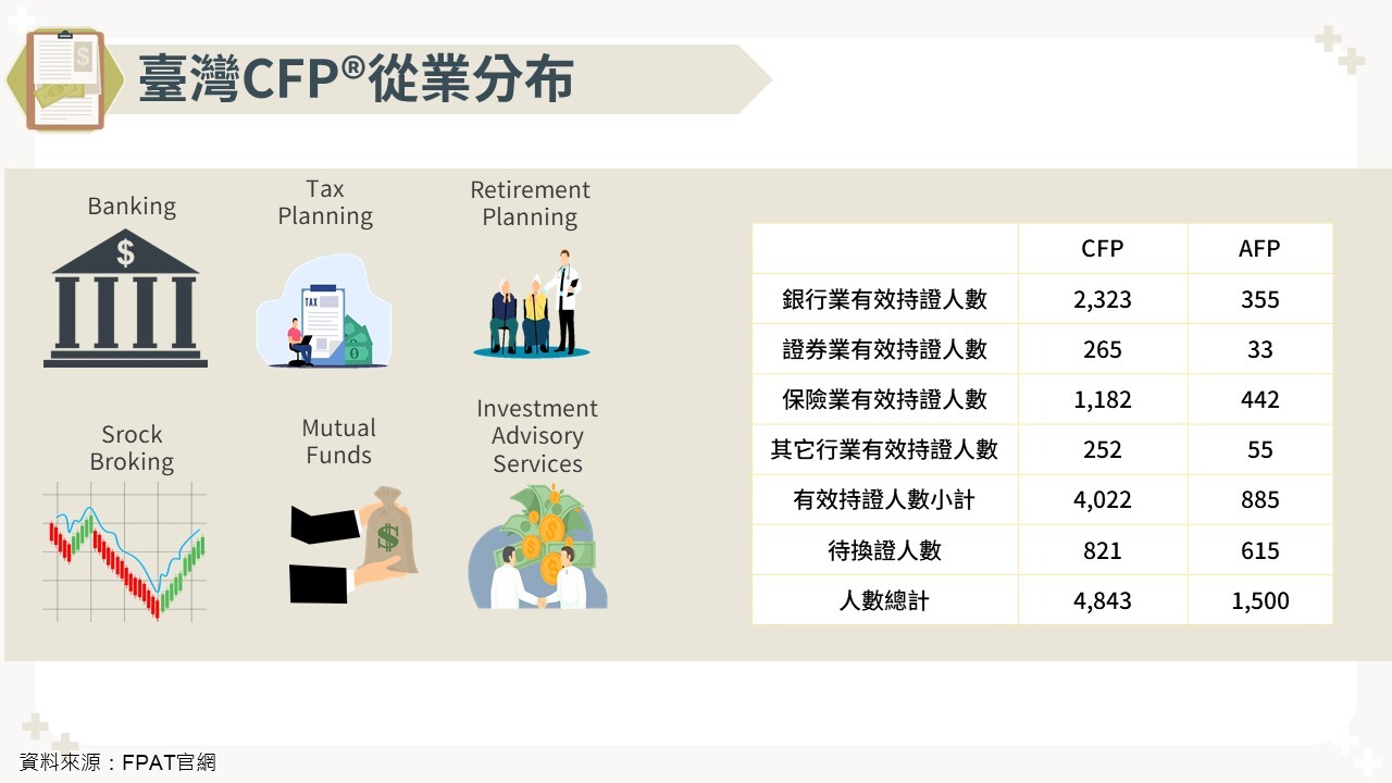 臺灣理財顧問認證協會(Financial Planning Association of Taiwan, 簡稱FPAT)於2003年11月成為 FPSB 的成員後,積極在臺灣推廣 CFP®/AFP 認證制度,各金融機構取得認證人數以銀行業、保險業、證券業為主。取得CFP®認證須完成教育訓練(Education)、通過考試測驗(Examination)、具備工作經驗(Experience)、遵守職業道德規範(Ethics)等金融專業要求。CFP® 持證者可透過跨地區的 CFP® 認證程序於各成員國取得該地區的 CFP® 認證。