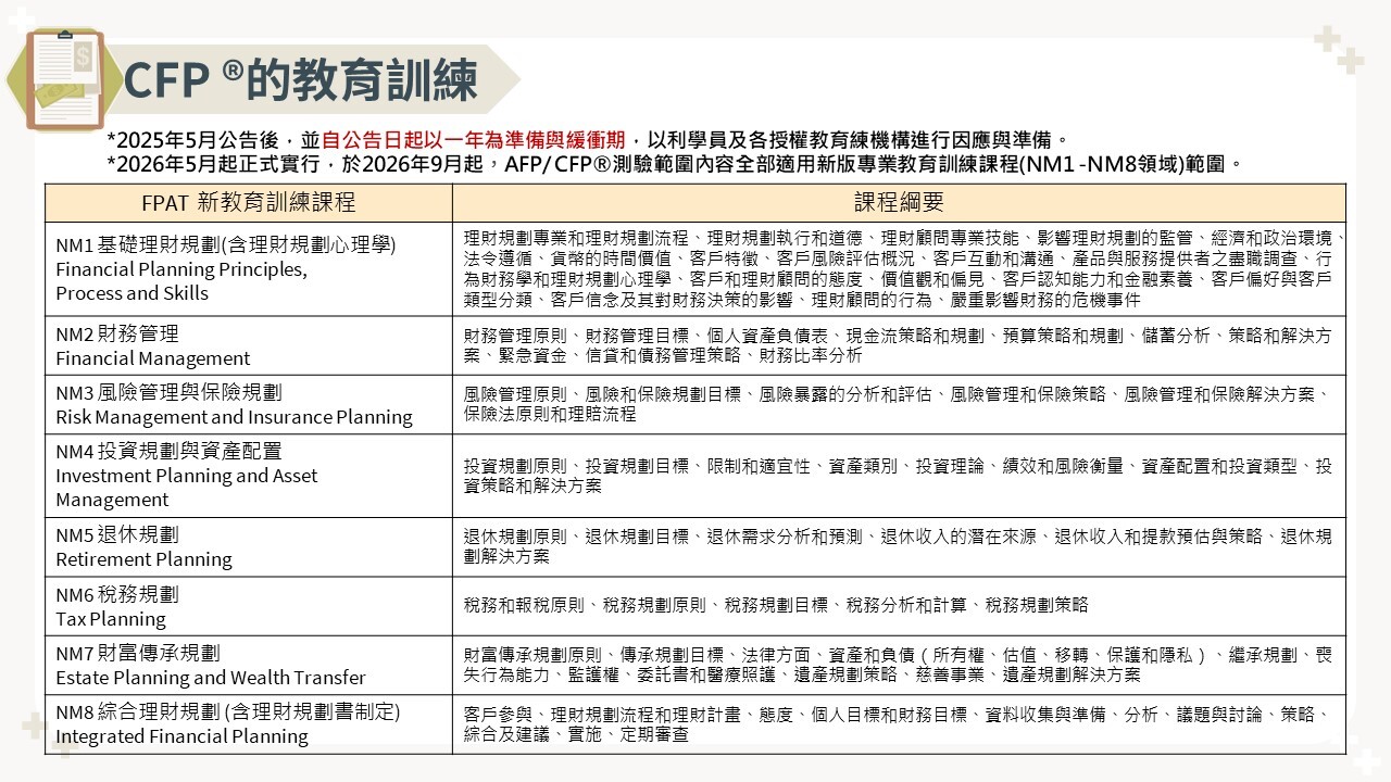 CFP®國際認證高級理財規劃顧問(Certified Financial Planner®),由國際理財規劃顧問認證總會 (Financial Planning Standards Board, FPSB,簡稱 FPSB) 負責制定全球 CFP® 認證制度標準,強調全方位理財規劃。